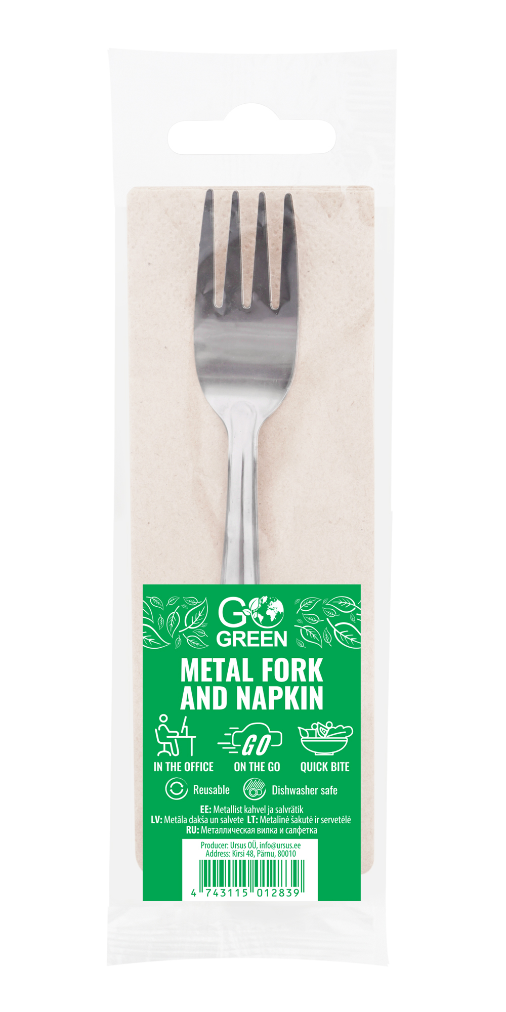 Go Green korduvkasutatav kahvli ja salvrätiku komplekt. Kahvel on valmistatud kvaliteetsest roostevabast terasest.  See on vastupidav, ei paindu ega murdu. Ideaalne kasutamiseks kontoris, autos, matkal või piknikul. Tänu oma kergele kaalule on söögiriista mugav hoiustada.