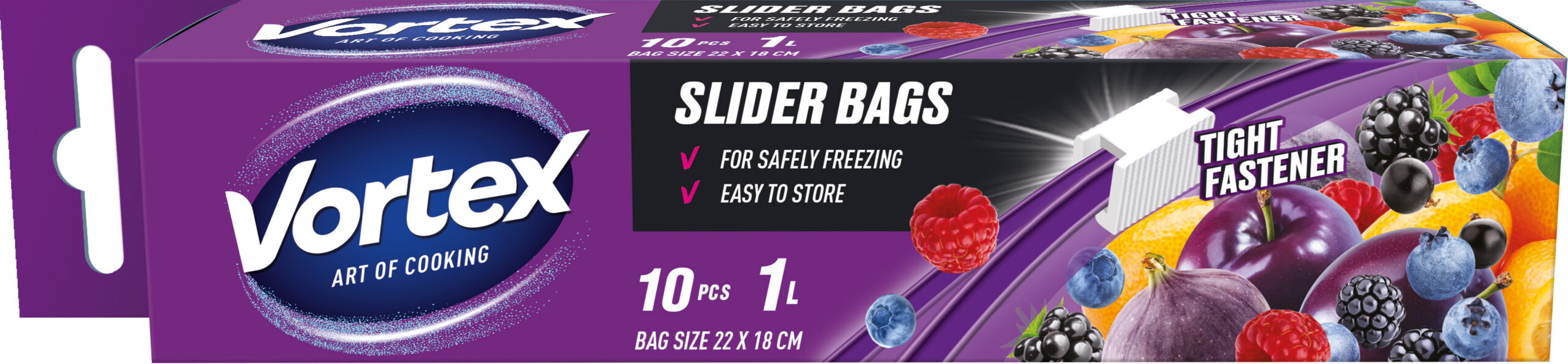 Liugurkinnitusega säilituskotid. 1L, ühe koti mõõt on 22x18cm. Pakendist 10tk. Kotid on tugevad ja vastupidavad, sobivad toidu sügavkülmutamiseks, värskete toiduainete hoiustamiseks, teravilja hoiustamiseks, vedelike hoiustamiseks ja sügavkülmutamiseks, reisimisel vedelike, ravimite, dokumentide hoiustamiseks. Koti materjal: polüetüleen. Hoida pakendatuna kuivas, kaitstuna otsese päikesevalguse eest.