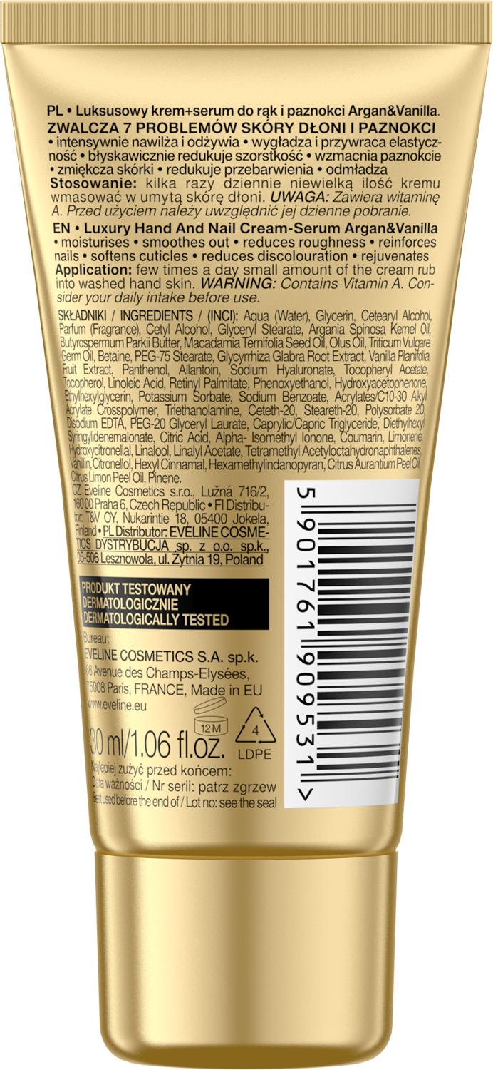 Argan & Vanilla Professional Luxury käte- ja küünekreem on kreem-seerum kompaktses suuruses, ideaalne kaaslane käekotis või reisil. See niisutab intensiivselt, silendab nahka ja tugevdab küüsi, pakkudes samal ajal rahustavat vanillilõhna, mis hellitab meeli.