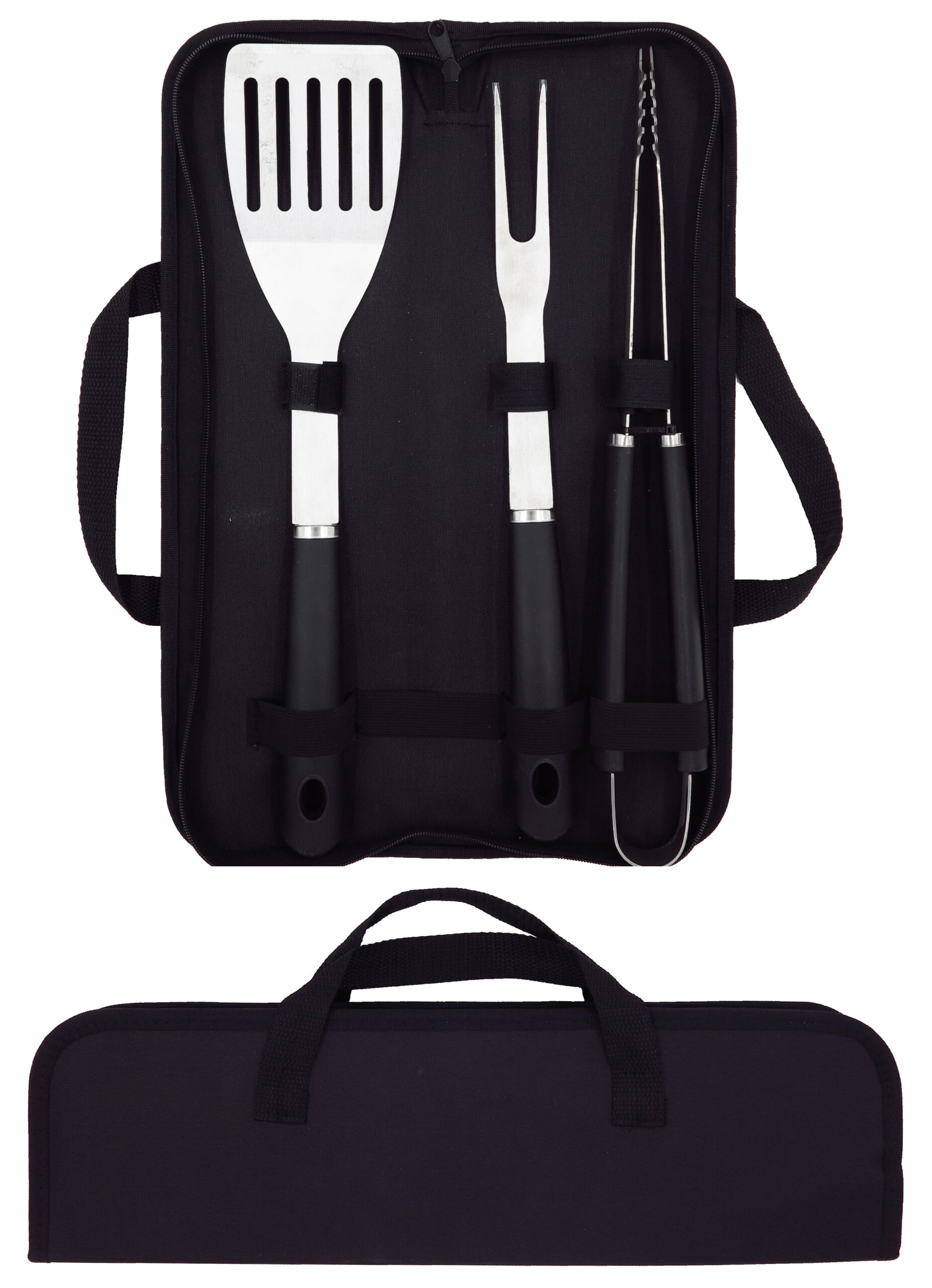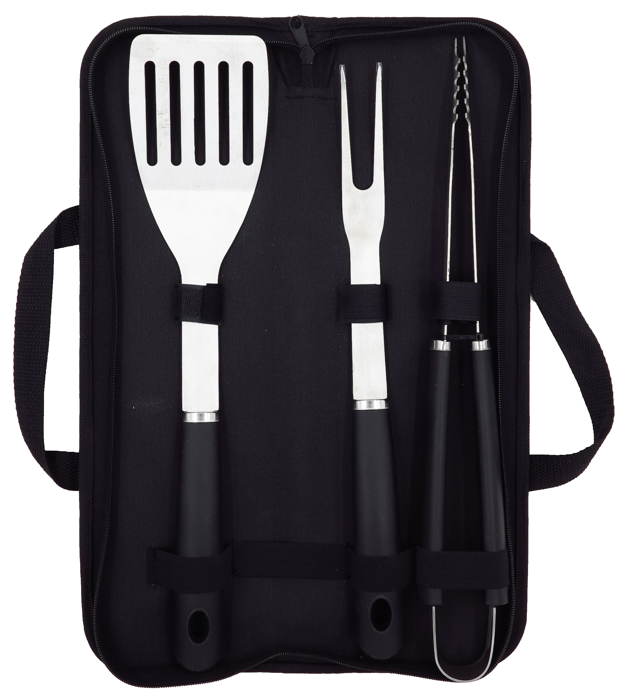 Kolmeosaline grilltarvikute komplekt mustas nailonist kotis. Kott on lukuga suletav ning sangad tarvikute mugavaks kaasaskandmiseks. Komplekti kuulub: tangid, labidas, kahvel. Tarvikud sobivad pere ja sõpradega grillimisteks, kodus toiduvalmistamiseks. Kõigi tarvikute ohutuks kotis hoiustamiseks on kotis kinnitusaasad.