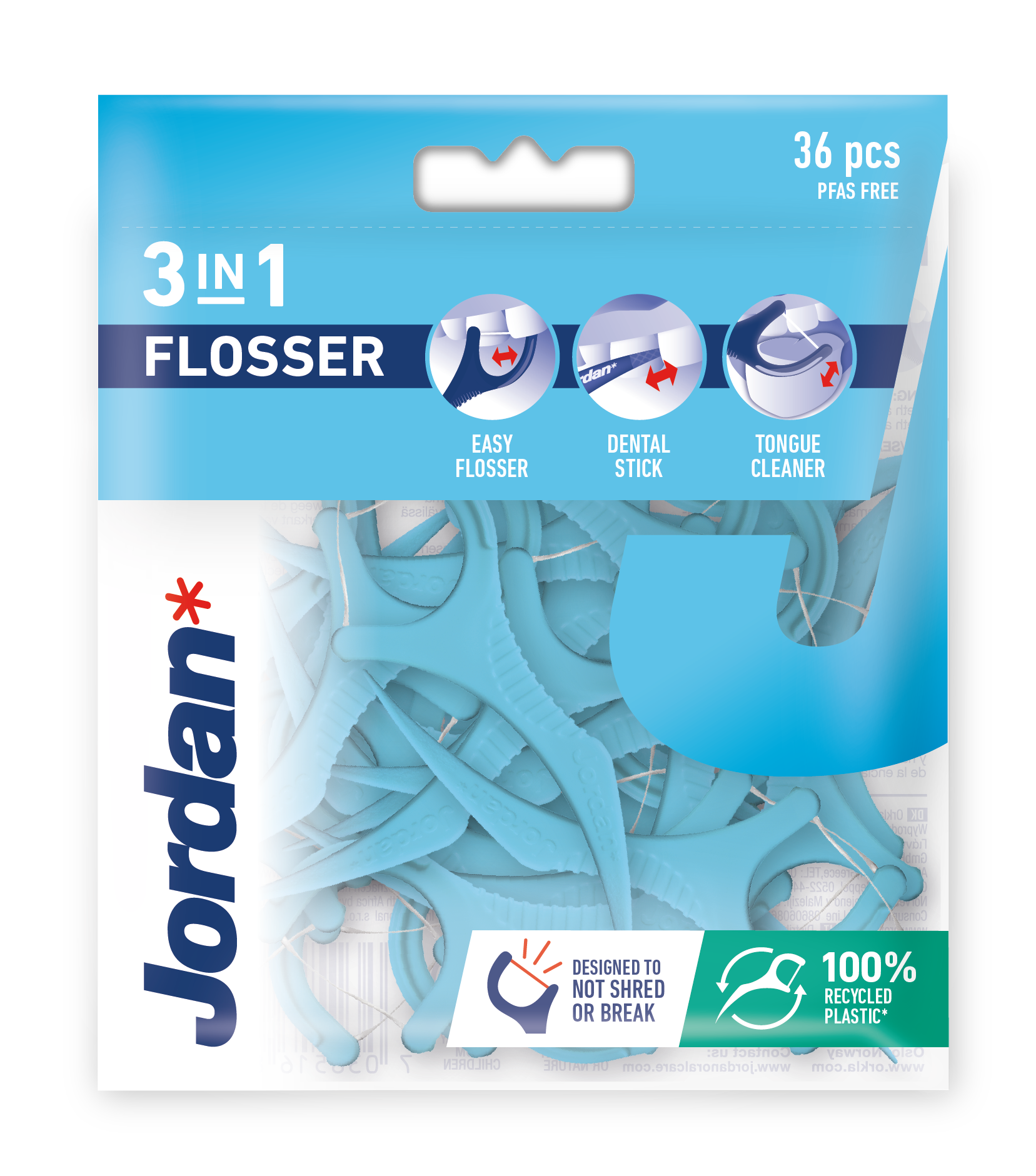 Kolm funktsiooni ühendav toode on kiire elutempo juures tõhus abiline: Hambaniit eemaldab hammaste vahelt katu; hambatikk eemaldab hammaste vahelt toidu osakesed ja stimuleerib igemeid; keelepuhasti aitab eemaldada keelelt bakterid tagades värske hingeõhu. Jordan 3-in-1 Flosser on praktilises taassuletavas kotis – ideaalne kaasas kandmiseks ja kasutamiseks, mil iganes Sa seda vajad!