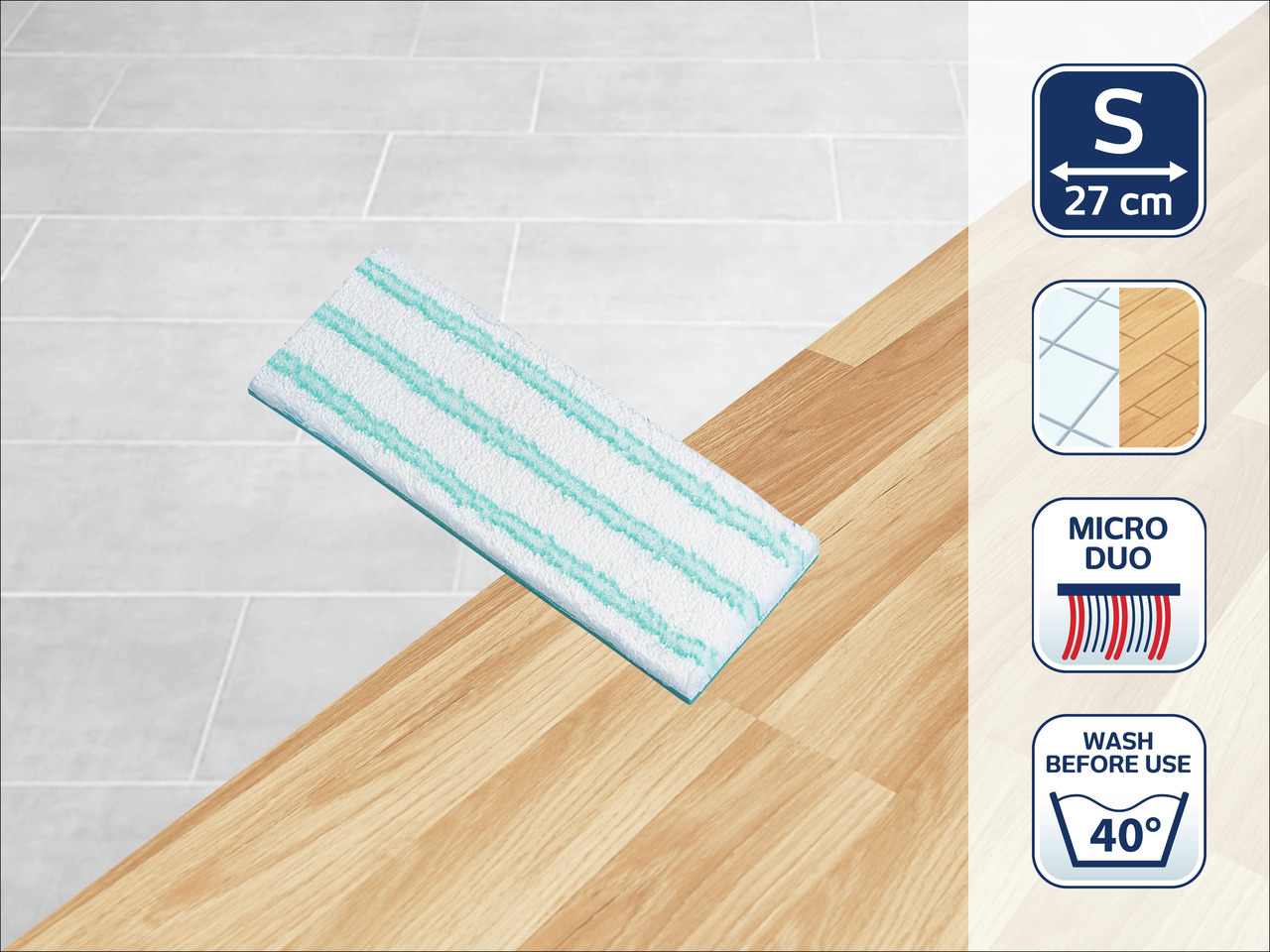 Spetsiaalsed polüamiidkiud teevad koristamise lihtsamaks ja tagavad suurepärase puhtuse. Sobib kõikidele põrandapindadele. Vahetuskatte laius 27cm. Väga hea vee ja mustuse imamisvõime. Kahe erineva tugevusastmega kiud tagavad paremad koristamistulemused.