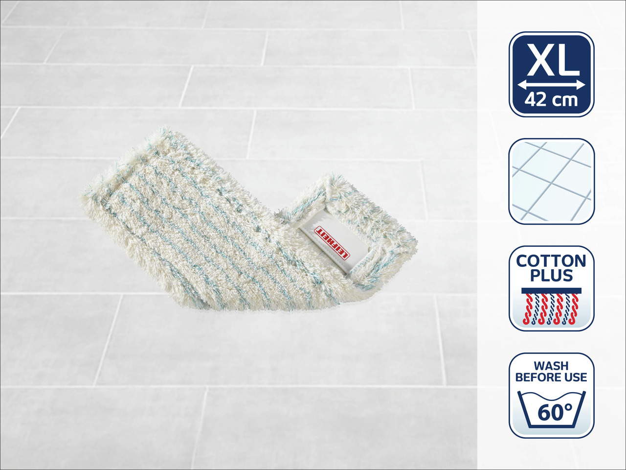 Täiusliku puhtuse ja sära saavutate oma kivi-ja plaatpõrandatel pestes neid Leifheiti eriti tugeva puuvillase ja supra seguga vahetuskattega. Supra kiud eemaldavad mustuse ka sügavatest pooridest ning puuvilla kiud imavad samaaegselt musta vee ja lahustunud mustuse endasse. Väga hea imavusega. Koostis: 60% polüester ja 40% puuvill. Masinpesu 60º C juures, mitte kasutada pesuloputusvahendit. Enne esimest kasutuskorda tuleks katet pesta, et tagada parimat tooteomadused. Sobib kasutamiseks Leifheit Profi sarja põrandapesijatel.