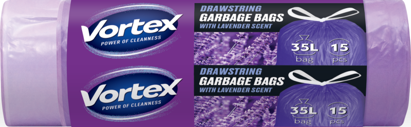 Rahustava lavendli lõhnaga nööridega seotavad prügikotid. Särava lilla värvitooniga kotid on tugevad ja vastupidavad. Koti suurusus 50x60cm, paksus 15 mikronit. Rullis 15tk.