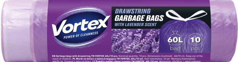 Rahustava lavendli lõhnaga nööridega seotavad prügikotid. Särava lilla värvitooniga kotid on tugevad ja vastupidavad. Koti suurusus 60x70cm, paksus 15 mikronit. Rullis 10tk.