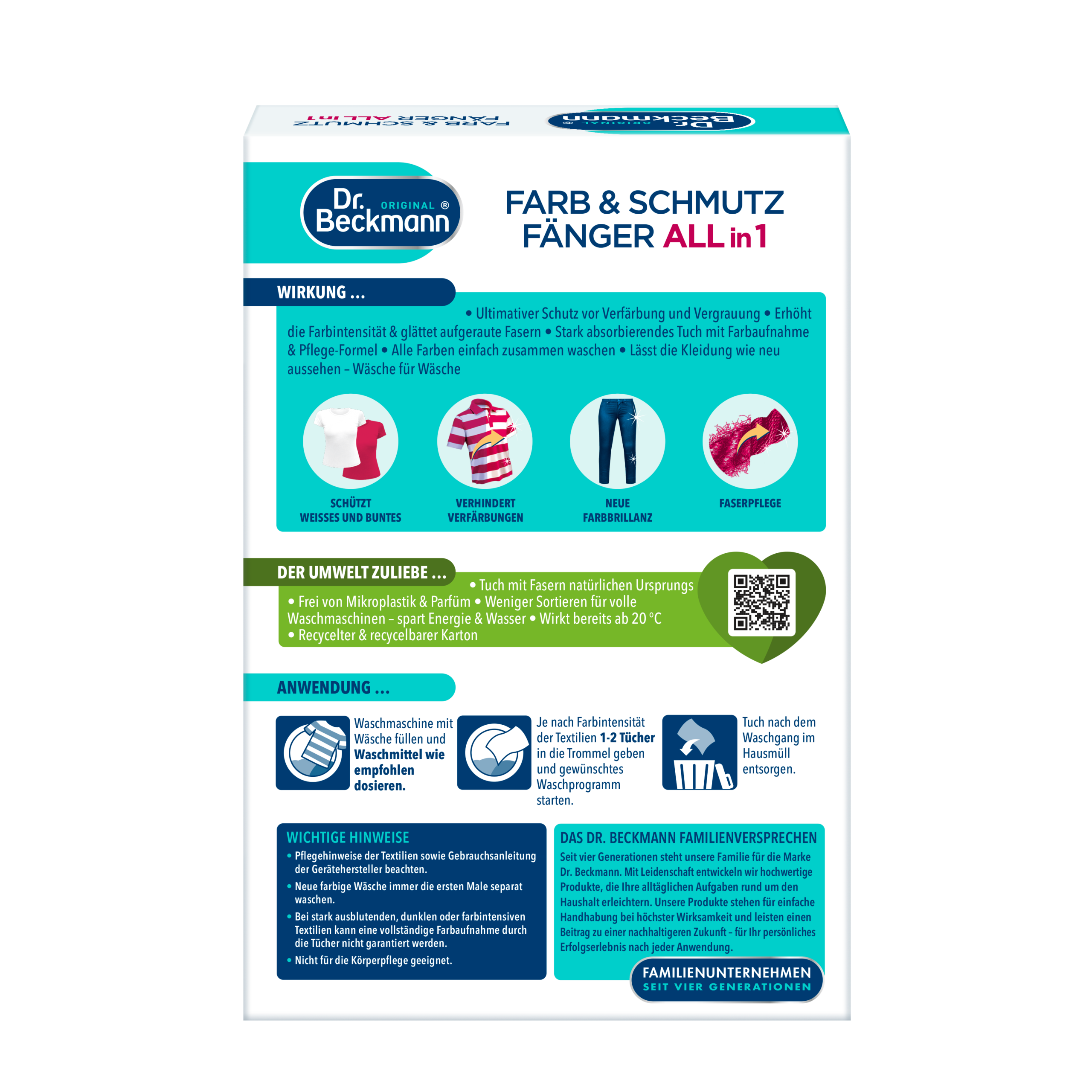 Hoolimata sorteerimisest võib pesu pesemise käigus muutuda värviliseks, sest alati mingi osa värvainetest ladestub kangastele, muutes sellega värvid tuhmiks. Dr. Beckmanni värvi- ja mustusekogumislapid aitavad säilitada valge pesu valgena ja värvid kirkana hoides ära pesus eraldunud värvi ja mustuse kandumise teistele kangastele. Värvi- ja mustusekogumislapid koguvad pesuveest värvi, katlakiviosakesed, mustuse ja aitavad vältida nende kandumist kangastele. Kogumislappide kasutamisel on võimalik pesta erinevat värvi pesu koos – värvilist, tumedat ja valget, mis omakorda vähendab pesu sorteerimist ning pesukordi, säästes nii energiat, aega ja vett. Uute värvi- ja mustusekogumise mikrofiiberlapi kiud toimivad kiiremini ja kindlamalt kui kunagi varem. Ekstra peened kiud võimaldavad hoiustada rohkem värvi ja mustuse osakesi ning sellega kaitsta värvi ja mustuse kandumist teistele kangastele.